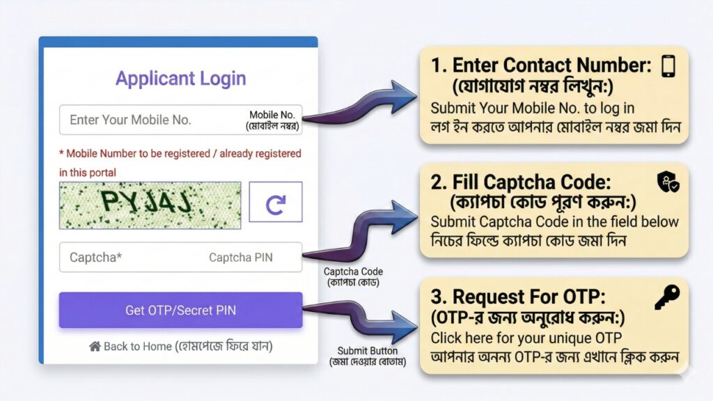 ⚠ মোবাইল নম্বর অবশ্যই সেই নম্বর হতে হবে যেটা আবেদন করার সময় ব্যবহার করেছিলেন।